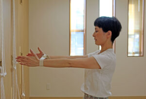 ③腕は腰幅に保ち、ベルトの張りを保ったまま、両腕を天井に上げる。