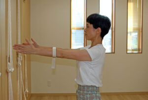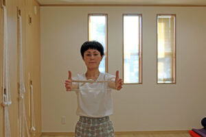 ①肩幅に両手を伸ばし、肘の下にベルトを巻く。