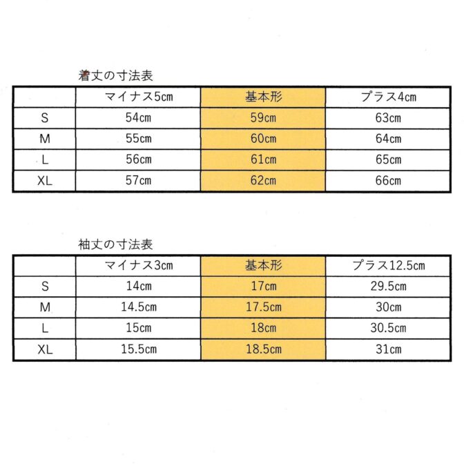 この基本のサイズからお好きな着丈、袖丈に変更したい方は、画像一番最後の寸法表をご覧になって、オプションコーナーで選択してください。