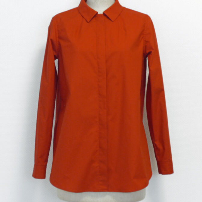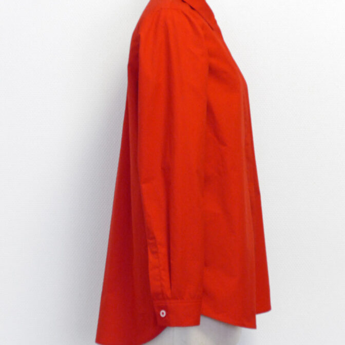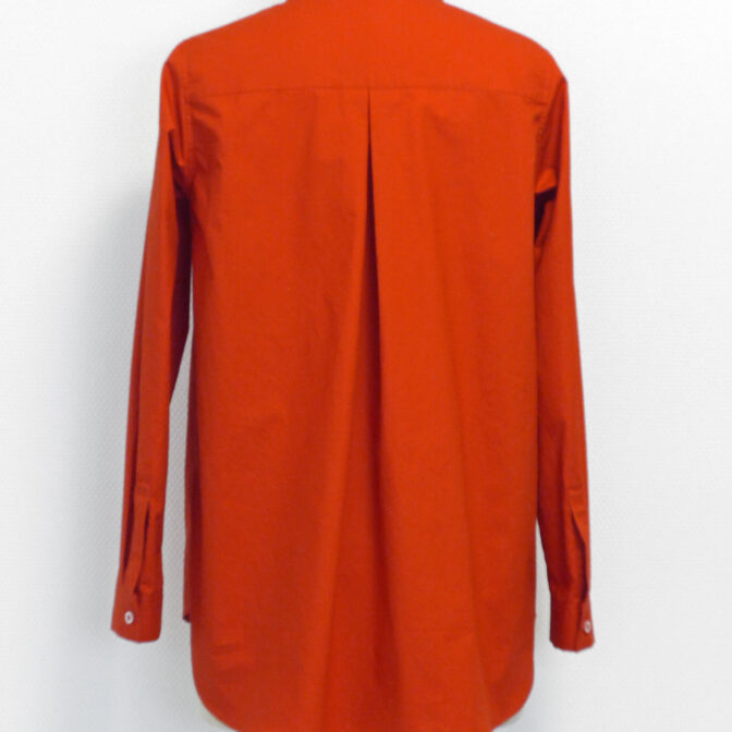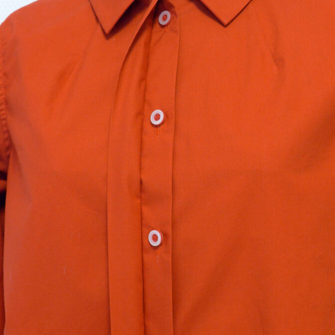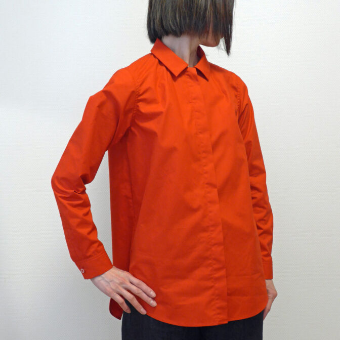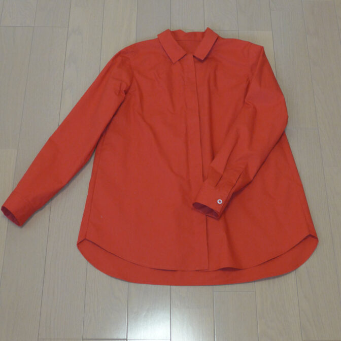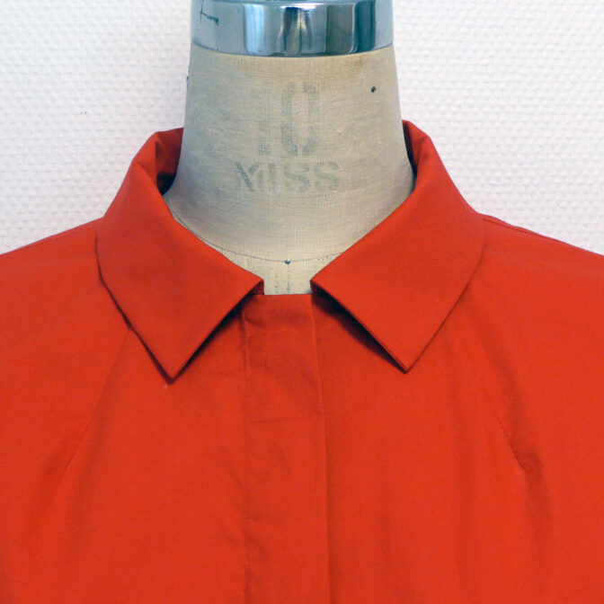 シャツとブラウスの中間のようなイメージで作りましたので、前あきは、比翼仕立てにして、衿は台衿無しの一枚の衿ですが、少し台衿のように立ち上がりがあります。