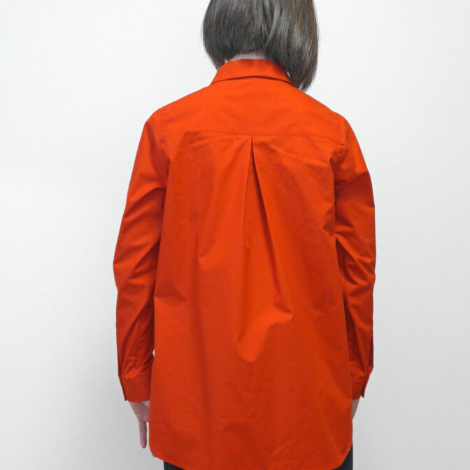 このシャツの生地はタイプライターといって、細い糸がとても高密度に織られていますので、薄手ですが、とてもハリ感があります。そして、サテンのような光沢もあるため、いろいろな表情をみせてくれます。