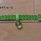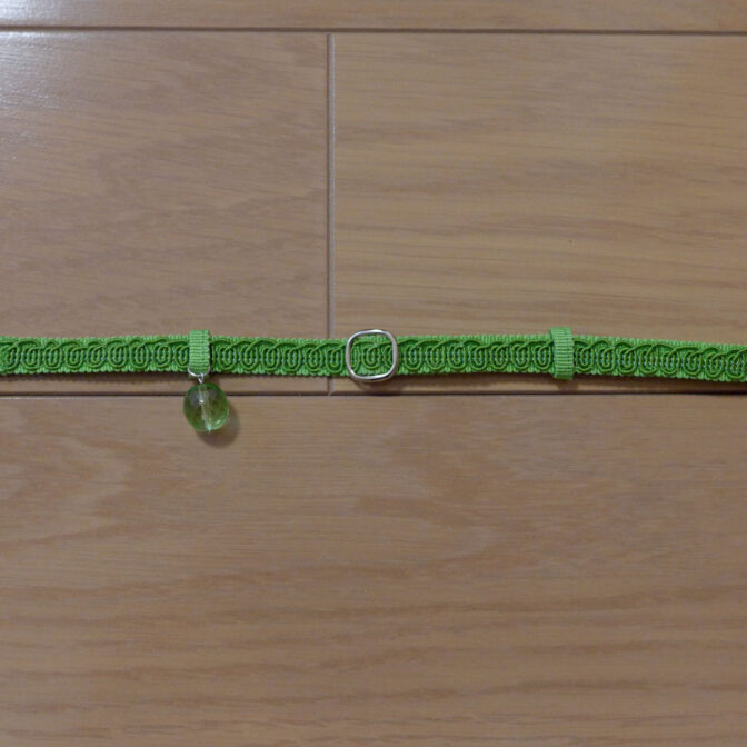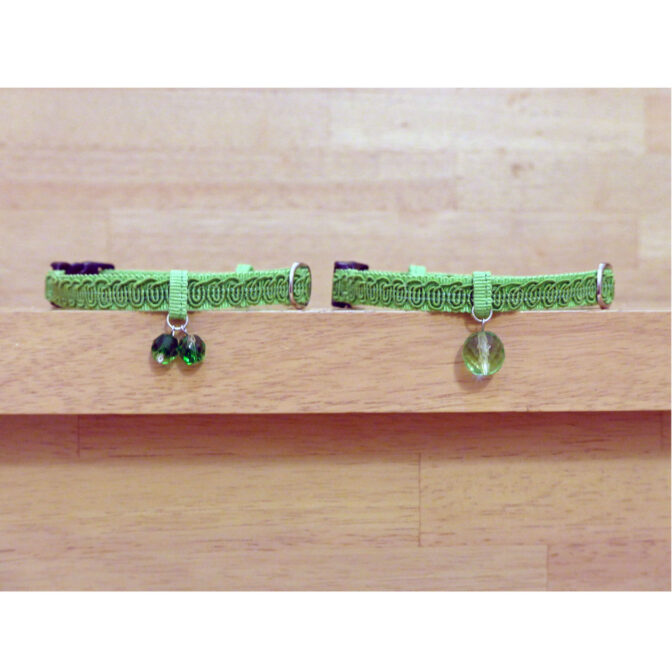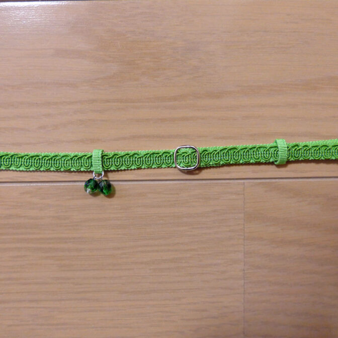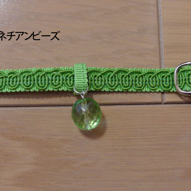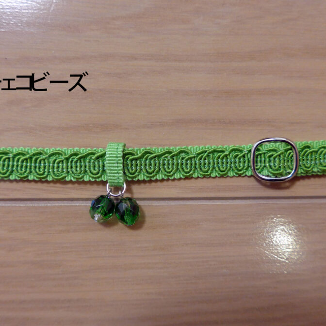 チェコのビーズはブレードよりも色の濃い鮮やかなグリーンをしていまして、首輪の萌黄色とのコントラストがきれいです。