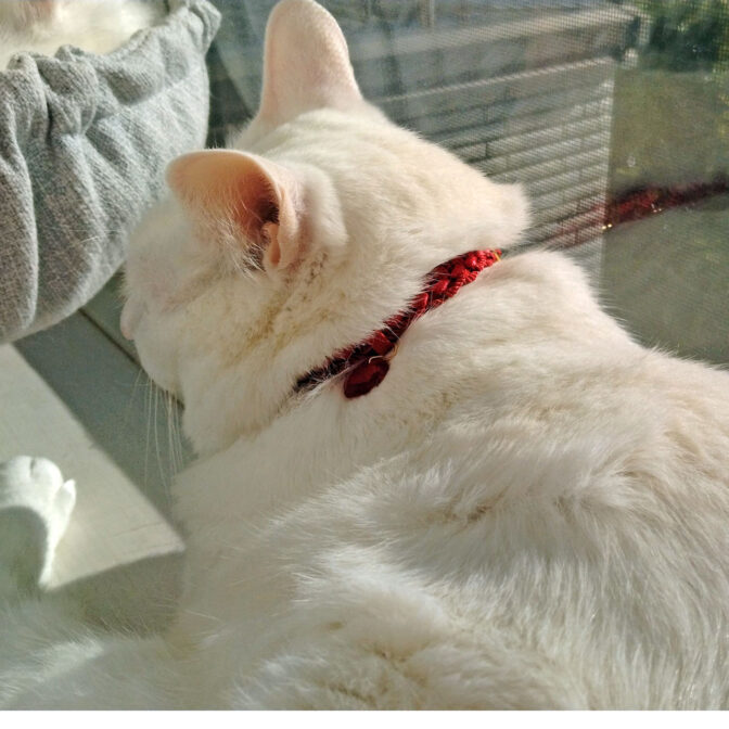 ツイストコードにサテンリボンが絡んだ、ちょっぴりゴージャスな雰囲気を醸し出している首輪です。