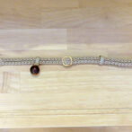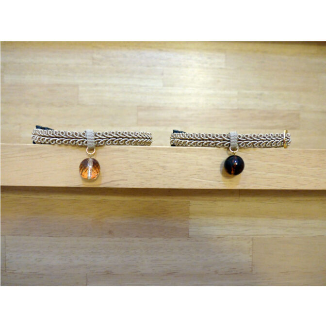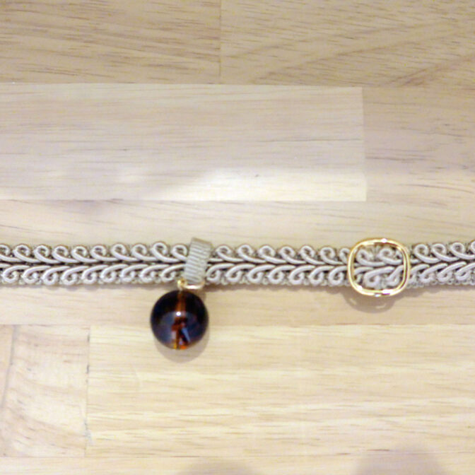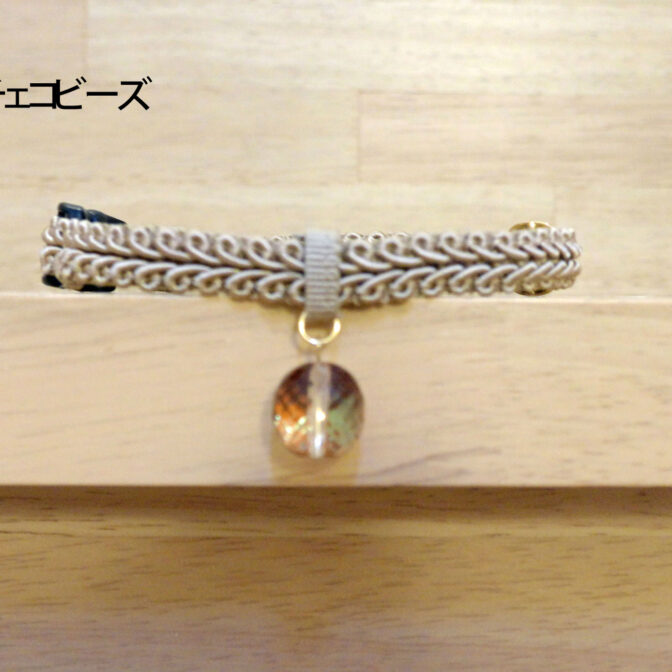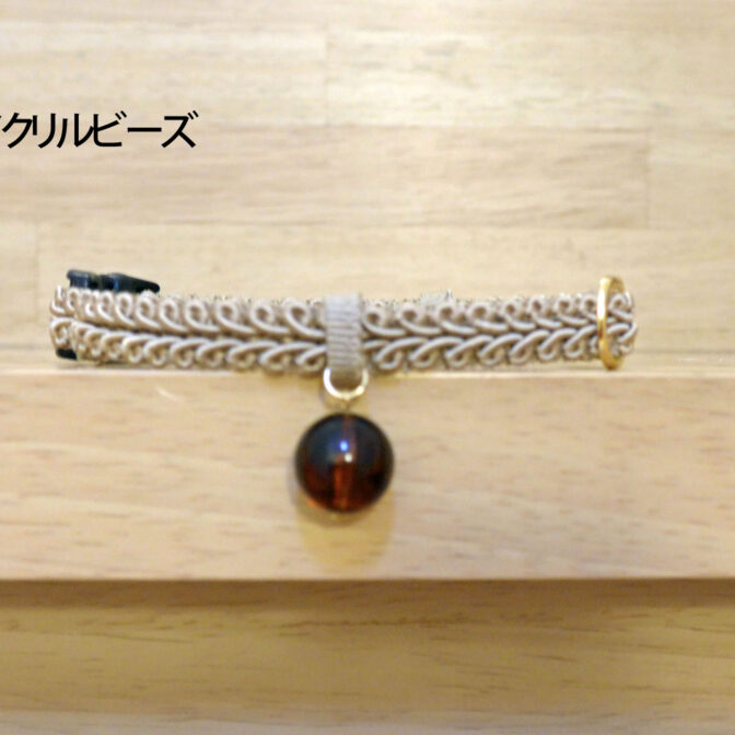右側の首輪のビーズは、ドイツのアクリルビーズです。べっこう飴のような色合いで、画像ですとちょっと分かりにくいのですが、中がこげ茶のマーブル模様になっています。